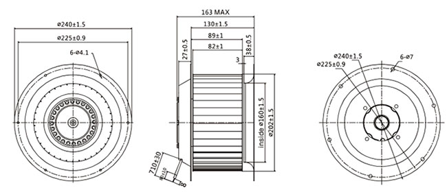 單進(jìn)風(fēng)前傾式離心風(fēng)機(jī)根據(jù)風(fēng)機(jī)外形可分為蝸殼前傾式離心風(fēng)機(jī)和常規(guī)前傾式離心風(fēng)機(jī)兩種。蝸殼前傾式離心風(fēng)機(jī)共有120mm、133mm、140mm、150mm、160m、180mm等六種。常規(guī)前傾式離心風(fēng)機(jī)有200mm、225mm、250mm、280mm、315mm、355mm、400mm、450mm等八種。