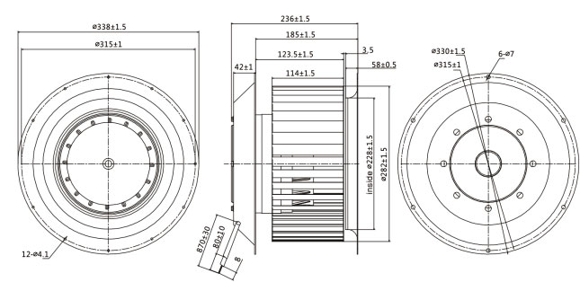 單進(jìn)風(fēng)前傾式離心風(fēng)機(jī)根據(jù)風(fēng)機(jī)外形可分為蝸殼前傾式離心風(fēng)機(jī)和常規(guī)前傾式離心風(fēng)機(jī)兩種。蝸殼前傾式離心風(fēng)機(jī)共有120mm、133mm、140mm、150mm、160mm、180mm等六種。常規(guī)前傾式離心風(fēng)機(jī)有200mm、225mm、250mm、280mm、315mm、355mm、400mm、450mm等八種。